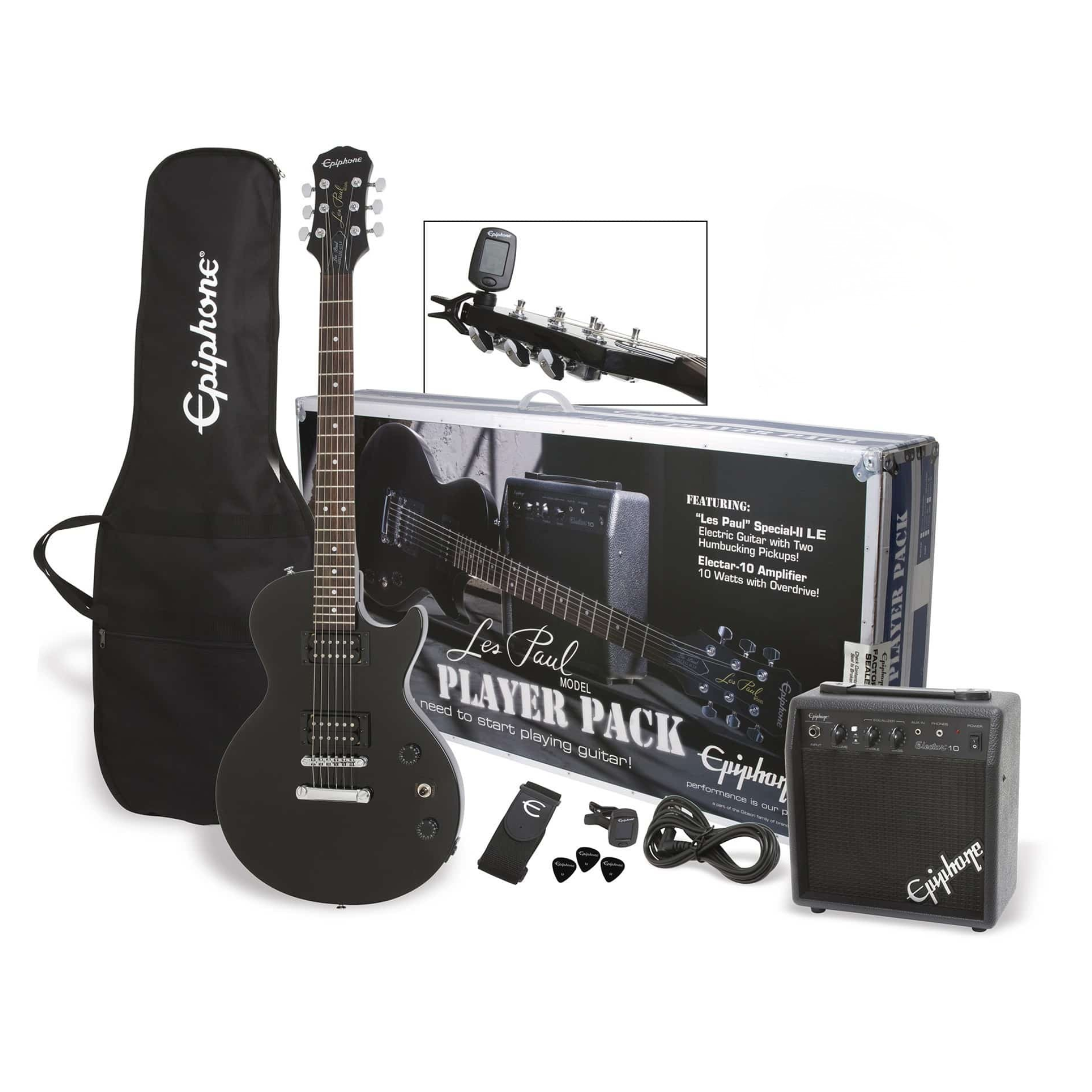 Le Les Paul™ Player Pack Epiphone (PPEG-EGL1EBCH1) rassemble tout ce qu’il faut pour commencer immédiatement la guitare électrique.