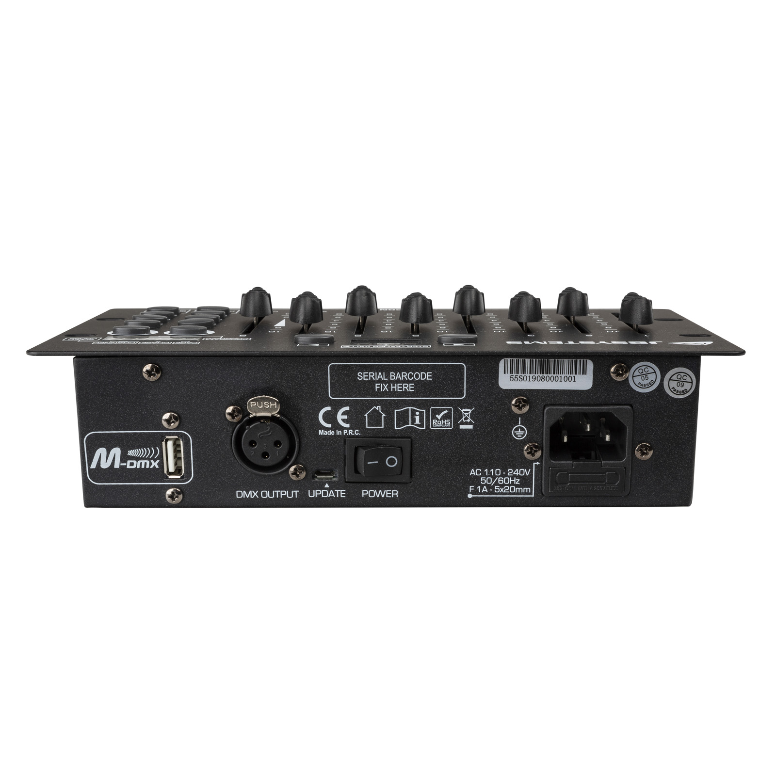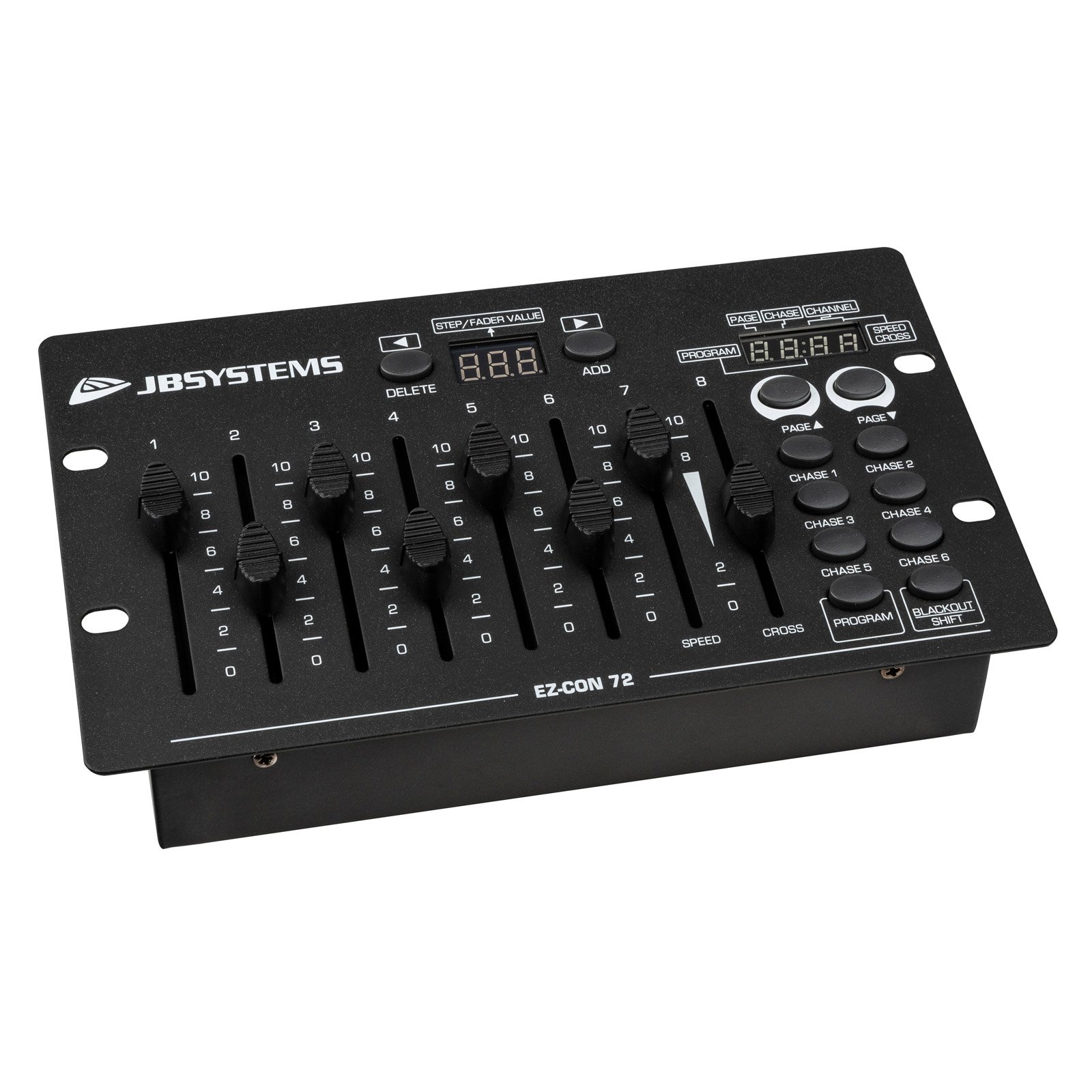 - 72 canaux DMX sur 8 faders et 9 pages.