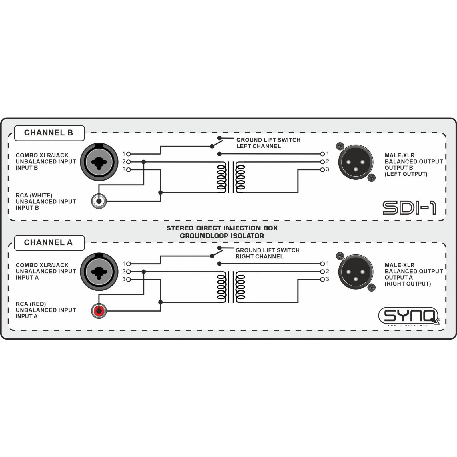 - Suppression facile des bourdonnements causés par des équipements électroniques tels qu’ordinateurs portables, PC, etc. grâce à un commutateur « ground lift » indépendant sur chaque canal