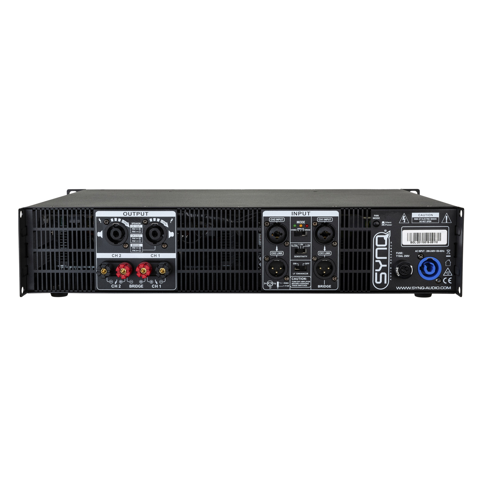 - 2 connecteurs compatibles Speakon® (sorties gauche, droite et bridge).