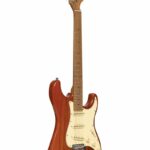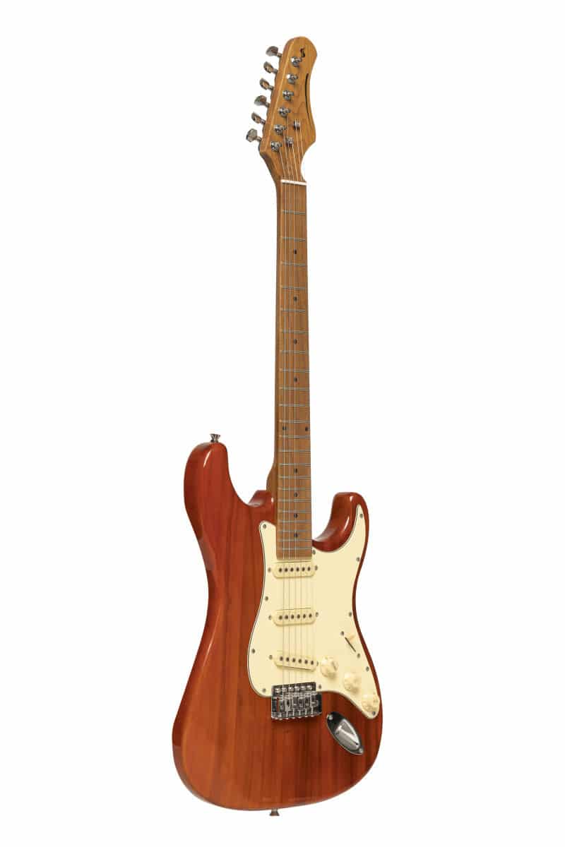 La Stagg SES-55STFRED est une guitare électrique avec corps en paulownia massif et manche érable torréfié vissé, 648 mm, finition satinée. Elle dispose d’un radius 12″, d’une touche érable 22 cases, de 3 micros simple bobinage Alnico, d’un sélecteur 5 positions et d’un vibrato type vintage.