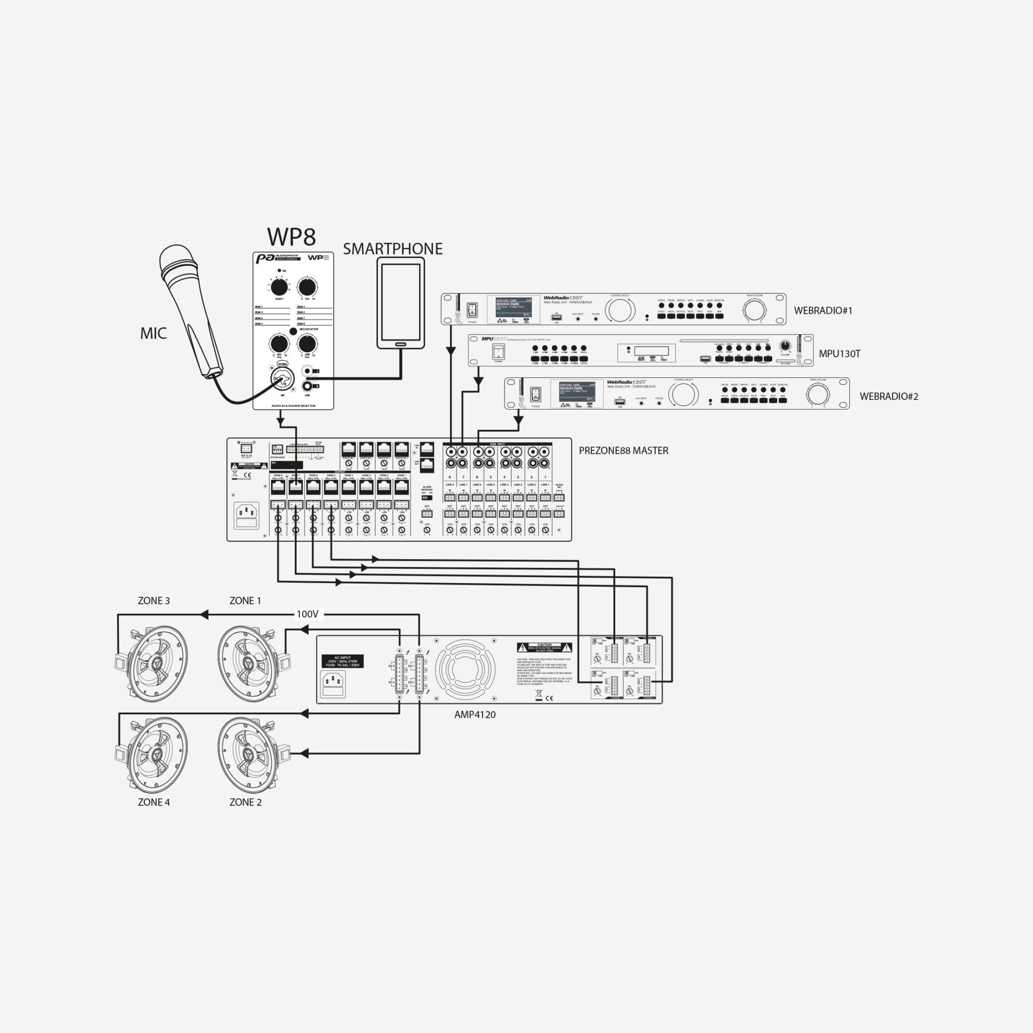 Contrôleur mural avec sélecteur source et entrée MIC/line pour matrice